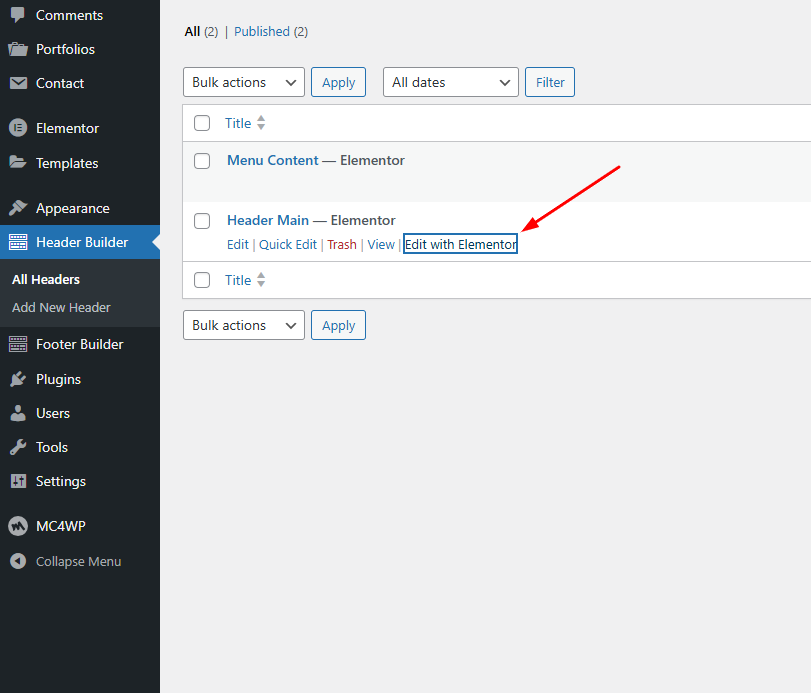 2. Find the “header name” in the Header builder custom post type and Edit with Elementor