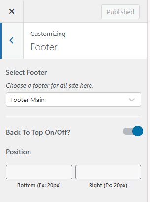 Go to Appearance > Customize > Footer to setup footer layout and back to top button.