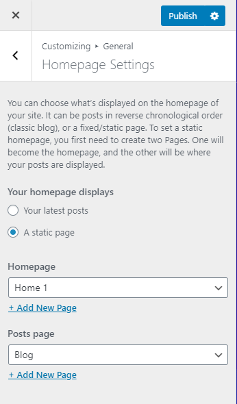 2. Homepage Settings Updated on December 16, 2019 This option will help you edit your homepage and posts page of your site. Go to Appearance > Customize > General > Homepage Settings to change your homepage and posts page of your site.