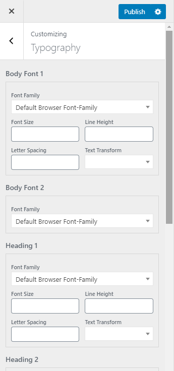 Go to Appearance > Customize > Typography to change font: body, heading(h1->h6), this applies to wp default pages ( Posts page, Single post, Archive,… ).